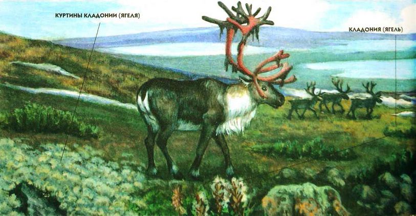 Тундра — царство лишайников. Множество видов лишайников покрывает почву и камни этой суровой зоны. Среди них ягель — олений мох. Ягелем называют несколько видов лишайника кладонии. Эти лишайники — основная пища северных оленей зимой, когда других растений в тундре почти нет.